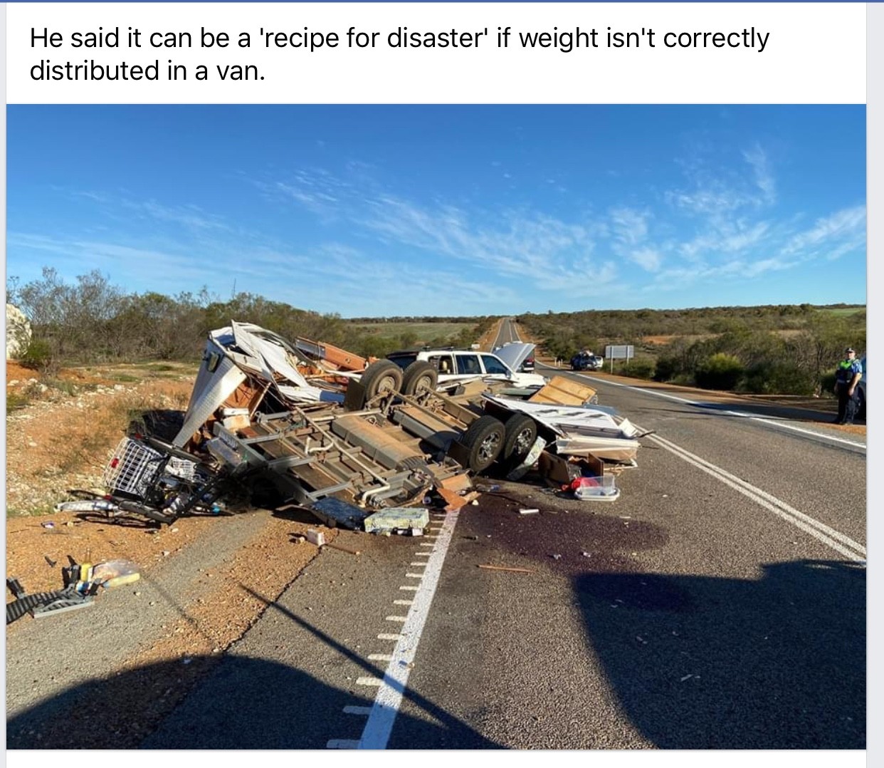 They were all on good highways. The last one we came across was 20 minutes South of Derby W.A. this time last year. Slight bend in the Hwy. and you could see by the tyre marks on the road where the van had started to fishtail and then Roll along with the Tug.