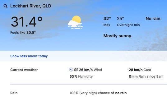 Lockhart River, Cape York. Have had to add a thicker sheet to the bed in the past week or so and have started turning the ceiling fan off when getting up for a midnight wee. Early hours temps have dropped to the low 20's which is feeling rather chilly. Humidity has dropped making things far more comfortable. Think we can say that the Wet Season has ended.
