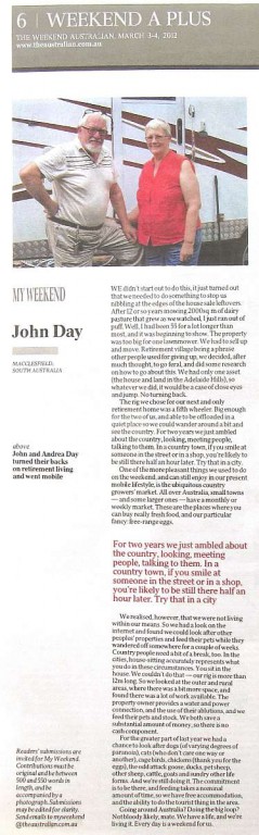 On page 6 of the A-Plus magazine section of the Weekend Australian, dated 3-4 March, is a short article that John wrote in response to a request for items from readers. It is headed by a photo of us beside our van.