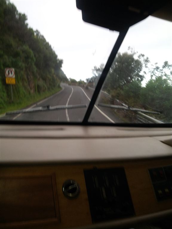 Almost scraping the left rear end on the vertical cliffs, and Nose well out over and on the other side of the white line,