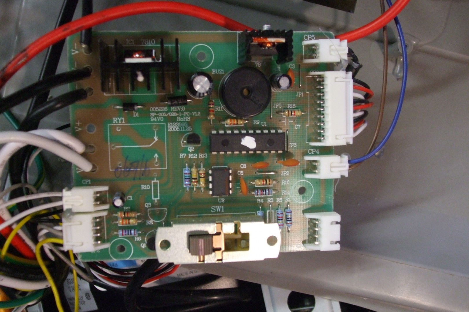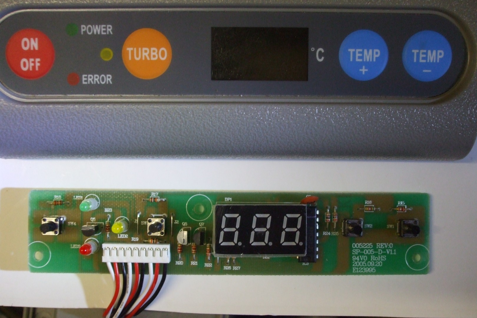 The CF-40AC Ver b is diferent again. All the processor is up in the control panel, & is surface mount components. Rather difficult to repair , apart from replacing thermistor or push button switches. Are these the same control panel as yours? CP5 NTC on the board is where the thermistor plugs in, I would unplug it & check the resistance. An easy check is plug a good thermistor into the board & see if the temperature is more realistic.