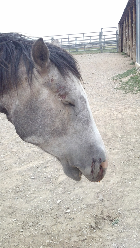 Picture of the same horse 5 days later, you can see the pink spot on the nostril where one fang mark was. The lip and face are now normal with no tissue damage.