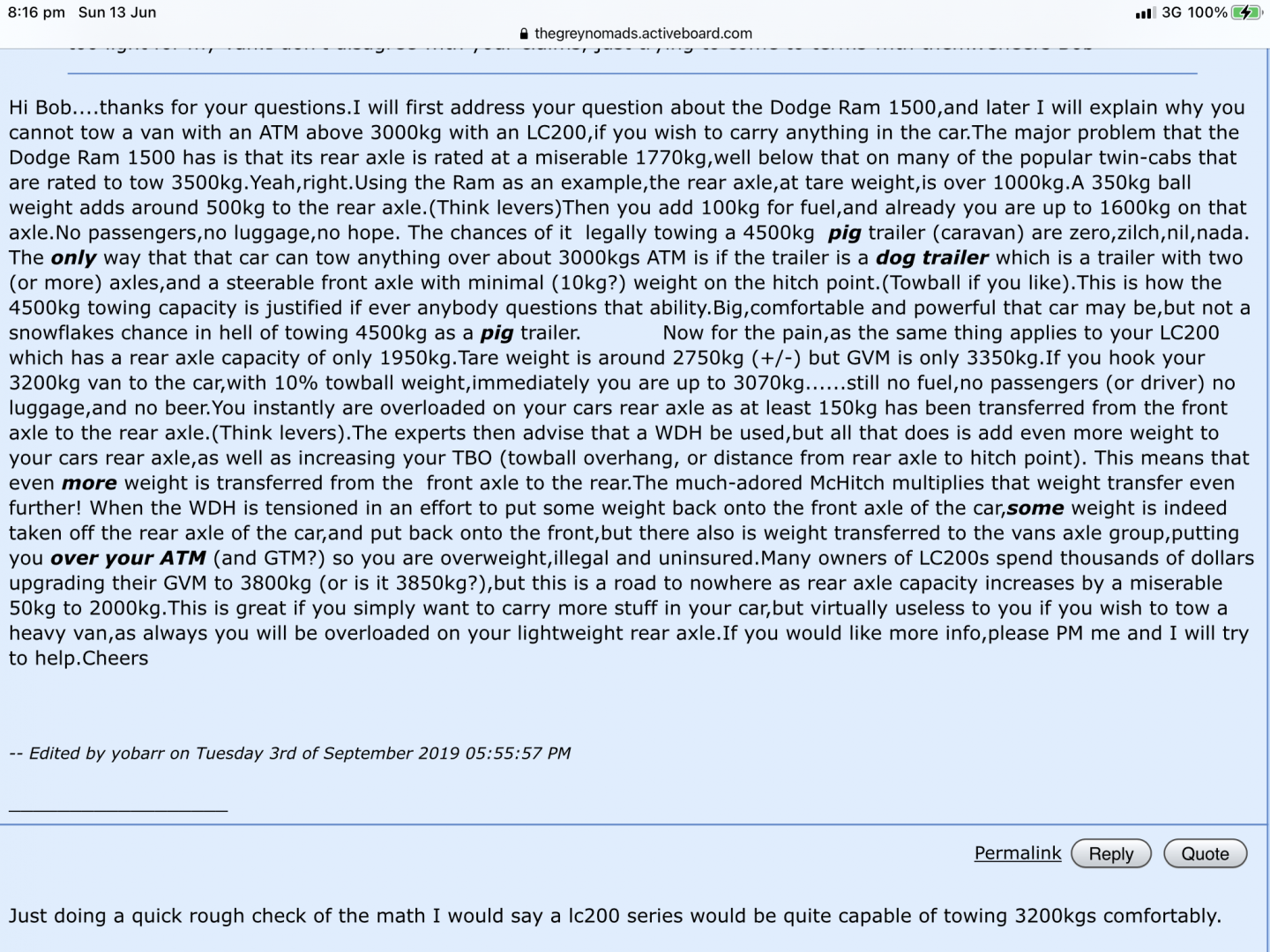 Paul,you no doubt are aware that the chances of a Ram 1500 safely towing much more than about 3000kg ATM as a PIG trailer are zip,zero,zilch, nil,nada. The big problem is the lightweight 1770kg (recently increased to 1860kg,I believe?) rear axle.When I wrote to the Ram distributor,I received a list of specifications,which I studied in depth before replying to their email.Because I had provided all the detailed figures,based on wheelbase, TBO, GVM etc,I asked them to clearly explain to me how that car could safely tow much more than 3000kg ATM as a PIG trailer. No reply as yet,but it was only 18 months ago. Big,luxurious,powerful it certainly is,but no chance of safely towing 4500kg ATM as a PIG trailer.Using the generally accepted 10% ball weight,you're stuck on around 3000kg ATM.This all was covered waaay back in a thread titled "Ram 1500",or similar,that you may be able to find,using "search".The BIG mistake people make when they waffle-on about being "Under my GVM" is that they haven't done individual axle weights. Cheers.