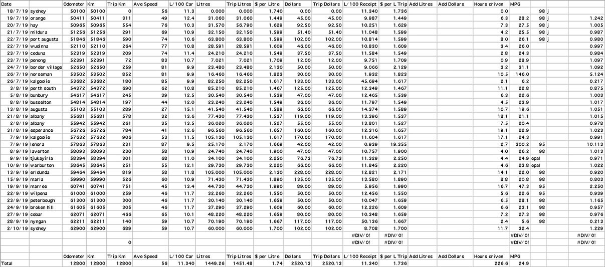 Our figures for Sydney to Perth (there are some odd numbers in there as that was topping up from our spare 50L, but it is the average. There are quite a few km of corrugated roads in there)