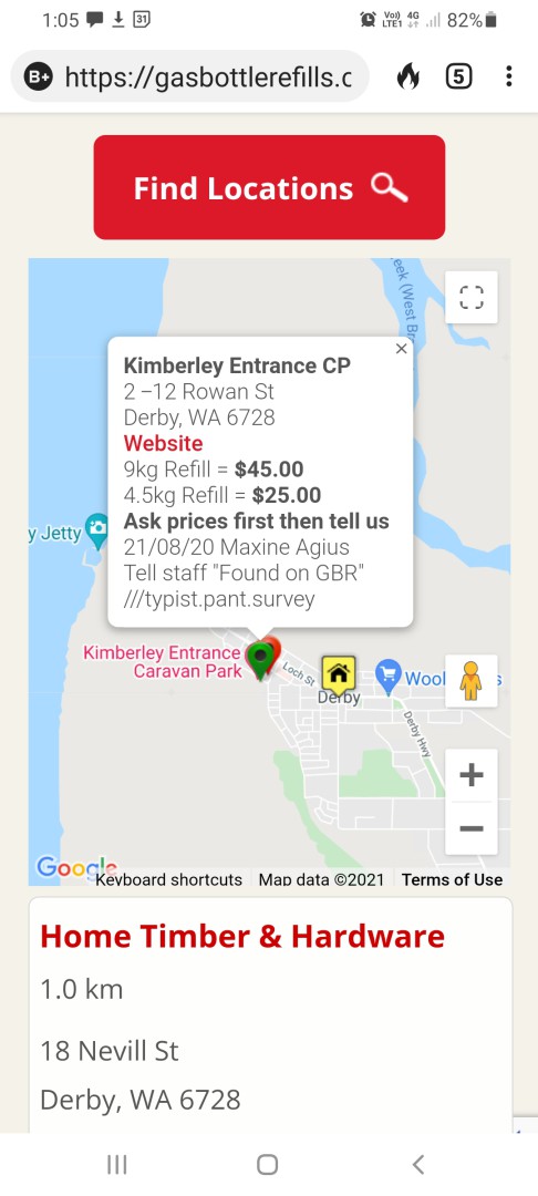 my goodness Yobarr your playing with yourself again you said a bottle was 80 odd dollars in derby now it seems that was just hearsay and you put a photo of mount barnet roadhouse to show the price of gas in derby?? if you have been to derby you will know the roadhouse is at least 300 klms from derby its saying fuel is $1 90 in perth then putting up a photo of fuel prices in southern cross