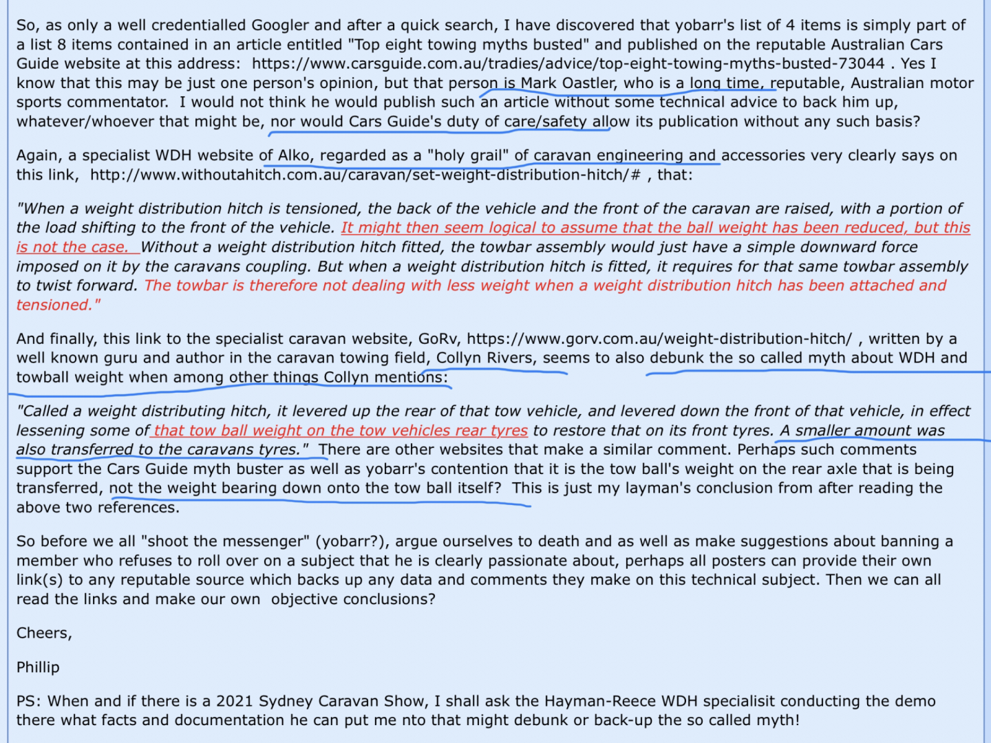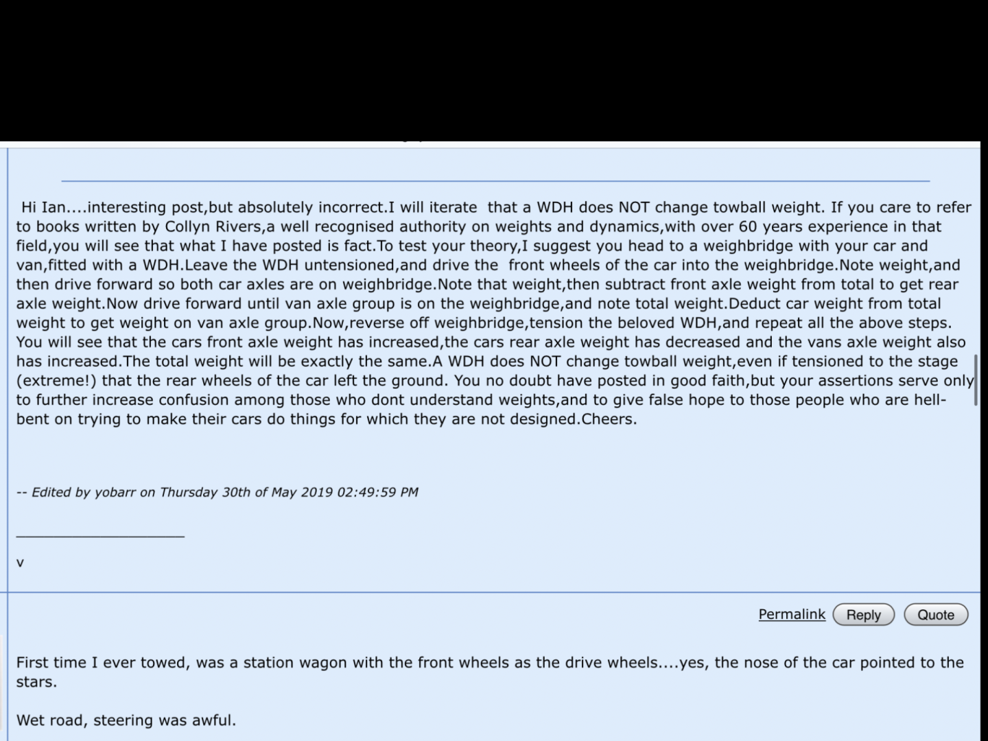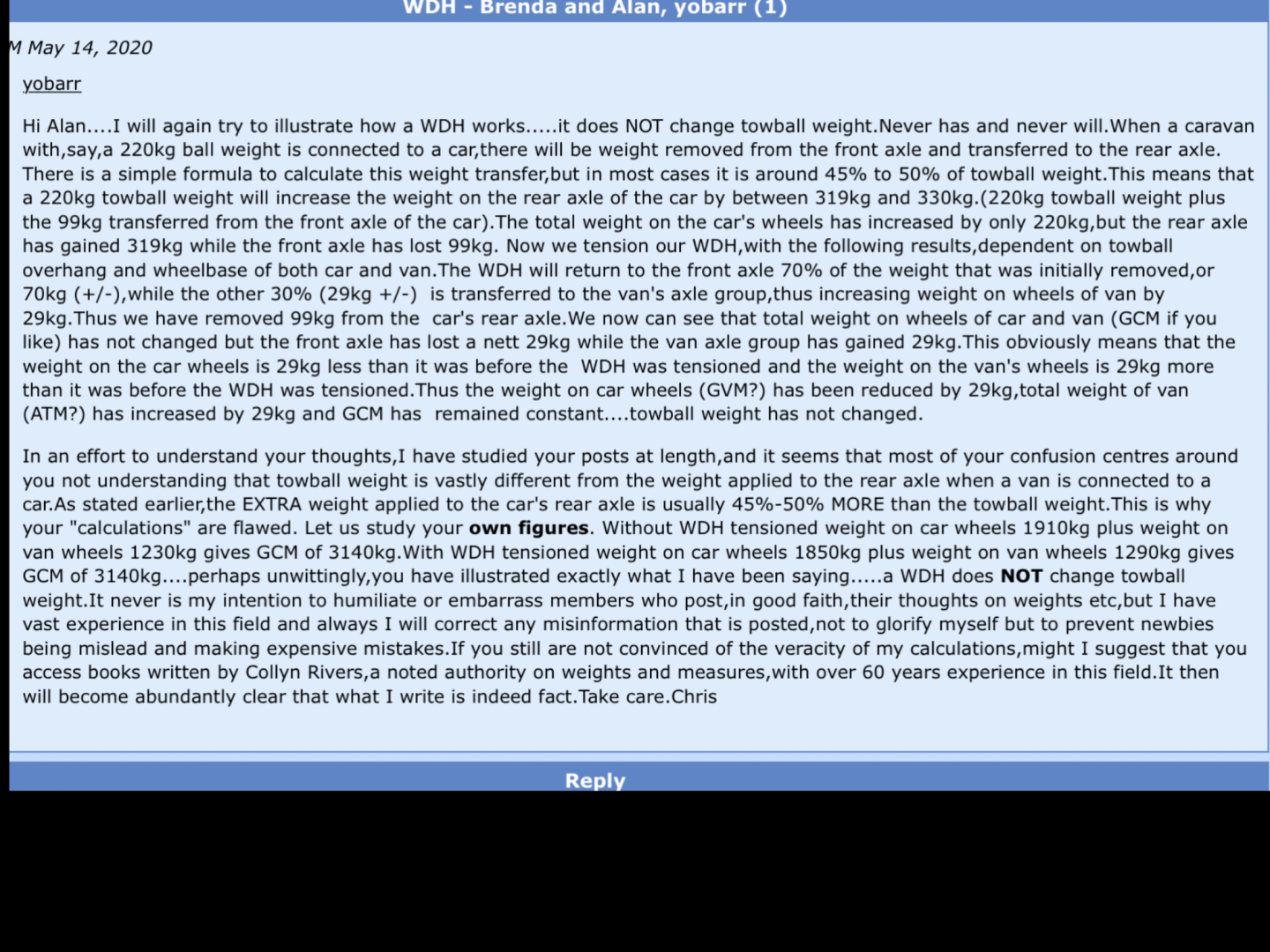 Not again! Alan, I have spent many hours documenting stuff for you, including copies of information from the Hayman Reese website, ALL of which showed that a WDH DOES NOT change towball weight, and because I did all this for you more than 2 years ago I thought that finally you'd woken up. Apparently not, but I simply can't be bothered iterating it for you. If you haven't learnt by now, it's unlikely that you ever will. You can take a horse to water but you can't make it drink. To help you, without to much more effort, I have posted screenshots of both a PM to you and a post from the forum, along with another suggestion that you Google "Weight distribution and load levelling hitches for heavy towing" by John Cadogan. You might like to access books written by Collyn Rivers, a noted expert on weights and dynamics, with over 60 years experience in this field, and a world recognised expert. Should you STILL fail to understand I suggest that you write to both Collyn Rivers and Hayman Reese and point out to them the error of their ways. You woukd no doubt then be happy to post copies of their correspondence with you, acknowledging that after 50 years in the business of weight distribution, they still know little? Cheers