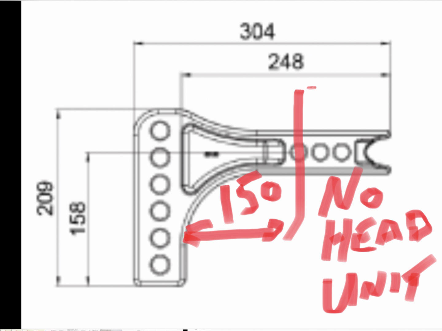 Just scaled this HR WDH as best I could with wooden ruler, and it is at least 206mm from last hole in shank to extremity of shank. And we haven't yet fitted the adjustable head unit for the towball, so we're going to have the towball around 300mm from the last hole in shank. Cheers