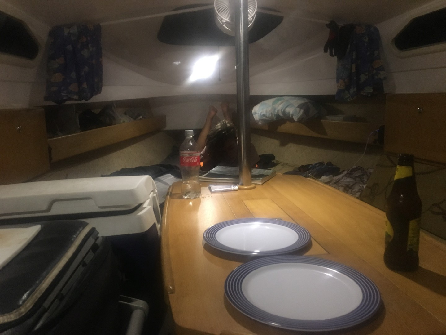 This is precisely the type of trip I was saying I was promoting as a possible alternative to travelling by road with motorhome, caravan or tent. No packing up to move on, all your facilities from cooking to seats, dining table, toilet and including bed for partners naps all on hand and legally usable at all times. Plenty of storage for food and wine, books and the like. A few nights ago we were treated to a roast dinner on our friends boat and last night we had movie night with our tv/dvd whilst lounging around our table.