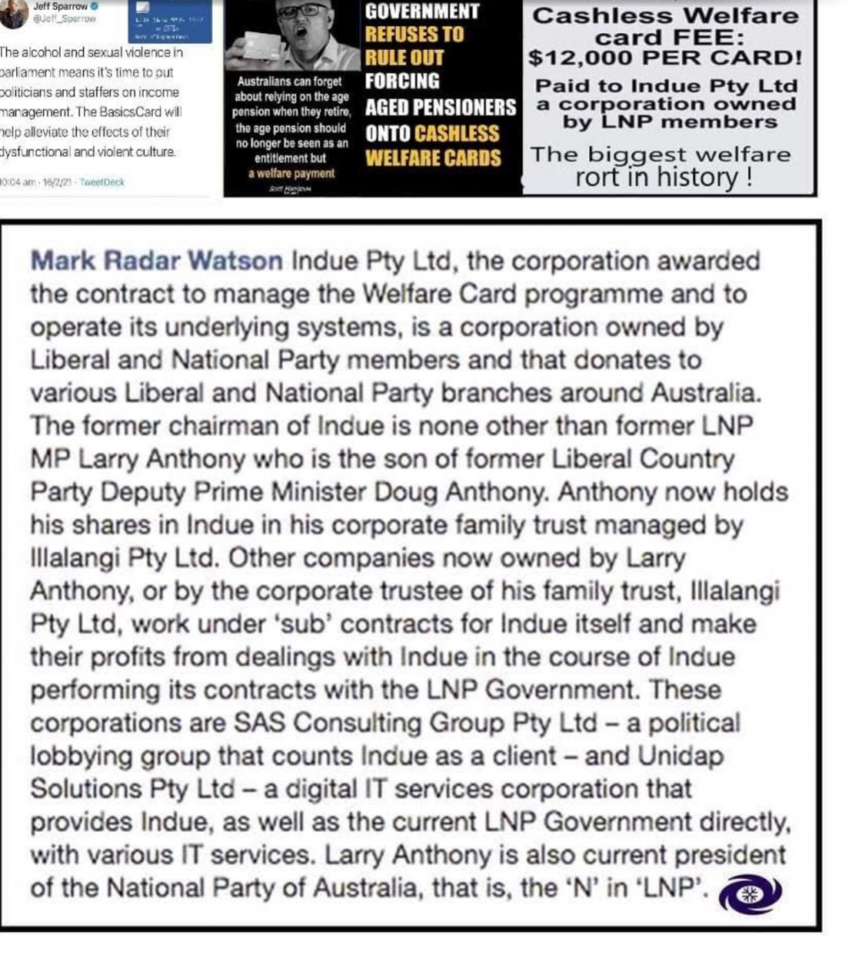 I have just looked on the net, and there seems to be a good deal of info re Indue, none of which at a quick glance suggests it is a clandestine plot to control pensions or pensioners. There are annual reports on line, all readily available, none of which appear to mention politicians or ex politicians as directors or major shareholders.