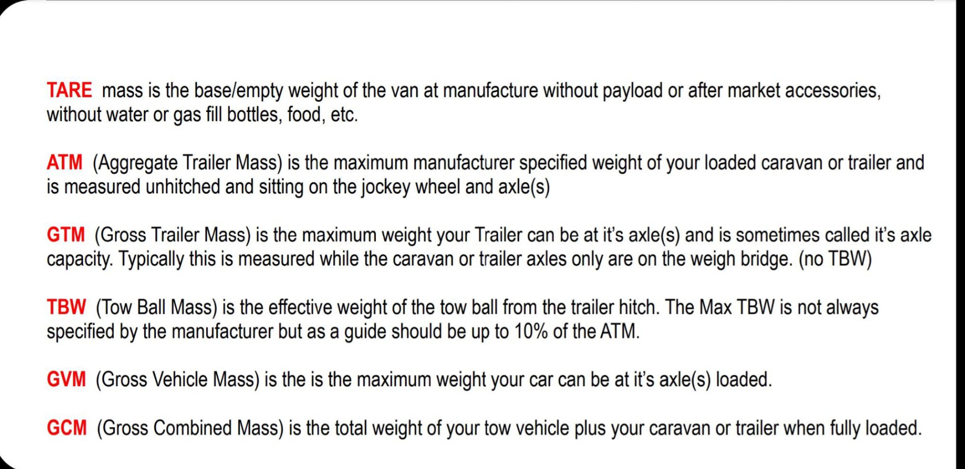 Tare Mass is the total mass of the caravan with no load, unoccupied and with all fluid reservoirs, if fitted, filled to nominal capacity, and with all standard equipment and any options fitted. After market optional add-ons (TV, mattresses, extra gas bottlles, awnings etc) are not inlcuded in the tare mass and are considered as a load, so must be included in your ATM measurement. The tare mass weight of your caravan can be found on the vehicle plate or in the manufacturer's handbook.