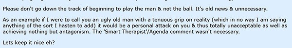 As an example if I were to call you an ugly old man with a tenuous grip on reality (which in no way I am saying anything of the sort I hasten to add) it would be a personal attack on you & thus totally unacceptable as well as achieving nothing but antagonism. The 'Smart Therapist'/Agenda comment wasn't necessary.