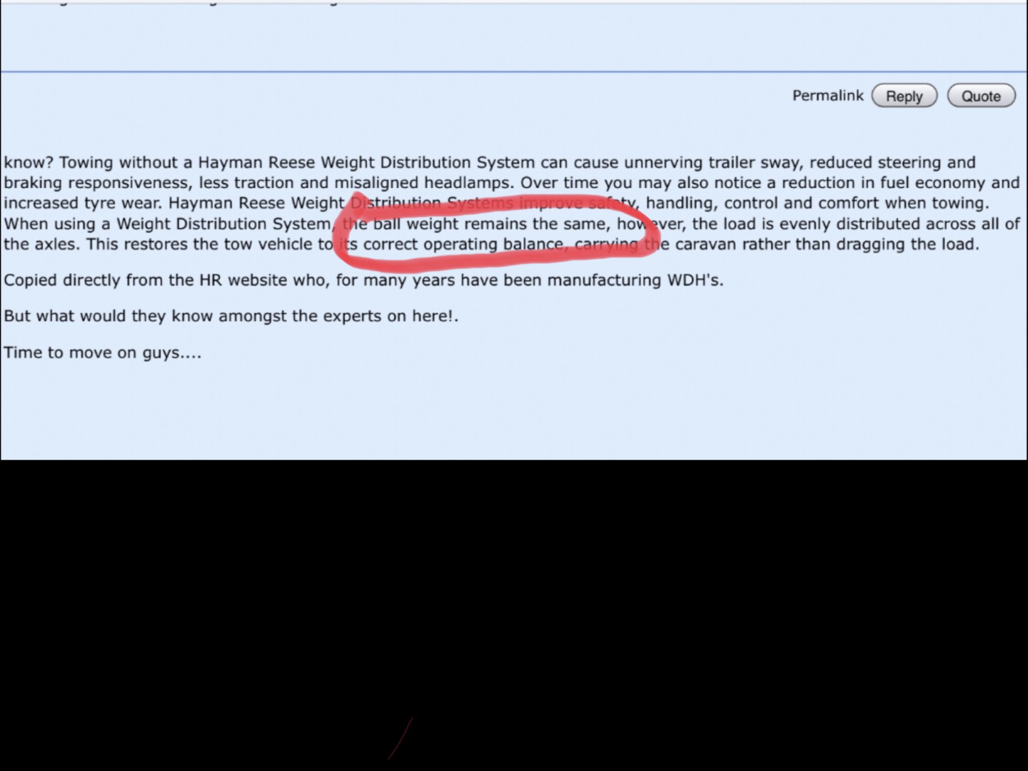 Alan, might I respectfully suggest that you stop posting rubbish about WDH systems, and that you give up on trying to change the laws of physics. All you're doing is causing doubt among some of our members who do not fully understand how a WDH works. You initiated this tripe over 2 years ago, and I , along with several other members, posted pages of information and facts in an effort to help you to understand that you were wrong. Because we had heard nothing further from you I believed that finally you'd seen the light. Now, 2 years later, you're back peddling the same rubbish. Previous dealings with you have alerted me to the fact that you don't actually READ posts, so I have included a screen shot of Montie's post from 5.28pm today. It is a quote direct from the HAYMAN REESE website, and I have highlighted the pertinent sentence. BALL WEIGHT REMAINS THE SAME. Perhaps you would do well to contact HR direct and inform them that, after 60 years designing, manufacturing and marketing weight distribution devices they STILL don't know what they're talking about. You might like to write a book "Physics, according to Alan". Only kidding, but I sincerely hope that FINALLY you've seen the light? Good luck. Cheers