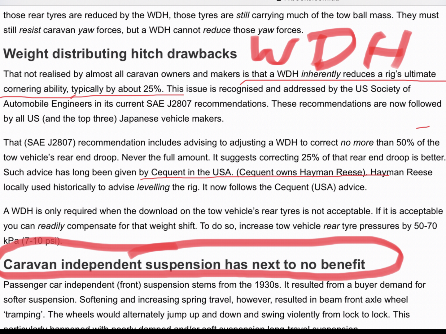 P.S The story below may point out to members a few home truths about WDHs, but I am obliged to advise that it is simply a screen shot from one of the many books written by Collyn Rivers. As can be seen, a WDH REDUCES cornering ability (safety?) by about 25% and should never be used to level the vehicles, with no more than 50% restoration being acceptable, but a mere 25% being suggested. Why bother? Ever heard of oversteer?