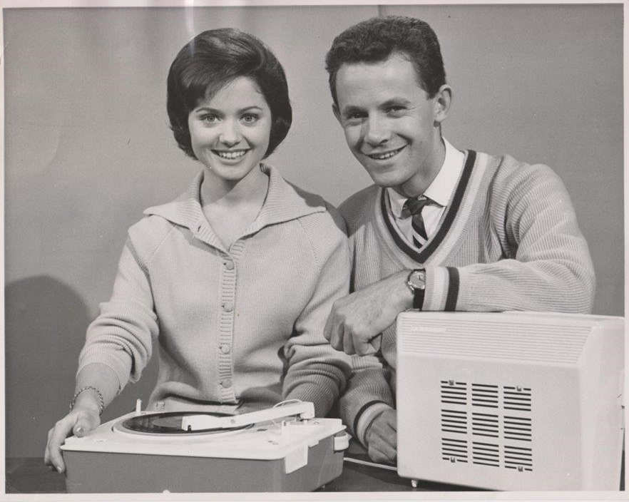 No takers? OK here is her co-host you might be able to work out who she is from this. I don't know what the record player is there for.