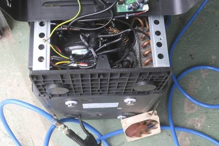 My 28L fridge I swapped the original 92mm fan with a 120mm Noctua fan, which had about the same volume of airflow but much lower power consumption.