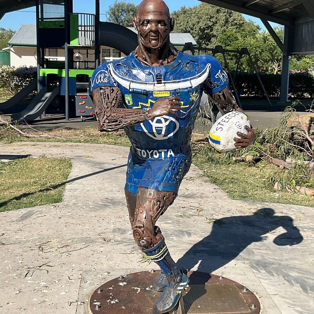 An unusual statue made from scrap metal by artist Milynda Rogers portrays the toughness of a true legend of the North Queensland Cowboys who also represented Queensland and Australia in Rugby League. Scott played 268 games for the Cowboys, 22 for the Maroons and 22 Tests for Australia, a remarkable 16 year career.