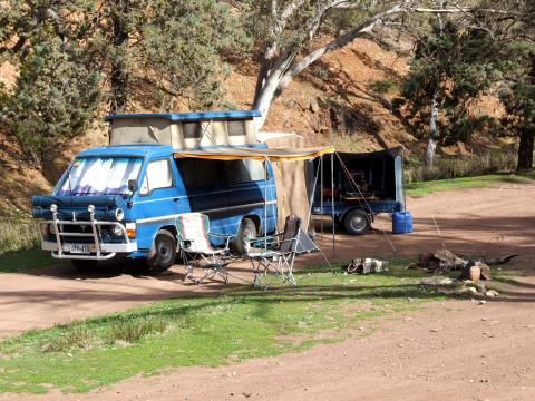 Gday Dick, AHHHH!!! our mid size recreational vehicle, little blue is a long wheel base toyota hi-ace yh61 model 1985 build, 2ltr 5 speed petrol with highway ratio diff., she carries 60 ltrs fresh water and runs a dual 100 amp (each) battery system through a redarc solenoid type isolater system, she also has an on board charger, we also carry an 80watt projecta briefcase solar panel just to give that little extra but found with stops of two to three days we havent needed it, we have a full kitchen plus 3 way fridge as well as plenty of cupboard and storage space, we also sometimes carry a 40 ltr engel, the double bed (front style) is left made up at all times, it is a sopru conversion finished in 1985, the van has always been a camper, we are the second owners and have had her tottaly rebuilt by toyota front to rear with NO expense spared from scratch, we have two large pvc pipes on the bullbar in which we store the rear annex and a side annex plus axe and tv antennae (which we never use), the rear annex comes off the rear door and has a sewn in floor, it was made by sar major in adelaide it is a god send as you know space is always at a premium and particularly so with a camper, slurpy ( our porta potty ) lives out there and we get dressed out there also chilly our engel sleeps there, and when we take our little mates (two mini cross foxys) they live in there so as you can see it is a multipurpose add on, we have done the block once with her ( twice in other vehicles) and never a moments problem, we have done quite a few forays in to the desert country and a lot around the coast, it nearly always returns 10 ltrs per 100 kms (or 30 mpg) at 80 - 100 kph, I have run heavy wire through to the rear direct from the second battery in to various fuses and cigarette sockets so we can run anything from the rear, I also have a 300 watt inverter out there, I have made her tottally self sufficient for water and power as well as food for 7 days and trying for more all the time, for further exploits in to more isolated country we tow a fully enclosed 5x4 supply trailer (squeeky) in there we have 60 ltrs of fuel, 120 ltrs of water large gas bottle and a full outside kitchen as well as carrying our firewood and satellite tv dish, and I have just bowed to pressure and installed the 1000 watt honda generator (sparky), with squeeky we can stay fully self sufficient for up to 14 days. I am always (when not at work) working on either squeeky or little blue to try to get the most out of them, we find, for what we are doing now, the setup is fantastic, but I wouldnt spend the rest of my days like this. we intend to sell up in 2.9 years time and buy a winnebego alpine so our off road or rough road forays will be finished but I think we have done them all or most anyway. she will be on the market and I will have a tear in my eye when she goes. I will post a photo of her "in squatters mode for you when I find one, I could post thousands of photos of various trips and miles and miles of video but I believe in keeping my home movies to myself and not bore other people stupid with them. but I do bring them out when the guests are drinking all my beer and wont go home that scares them off quick smart. anyway thats "little blue & co"