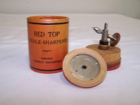 the needle sharpener was a pretty big and robust affair, it had a handle at one end, one mounted the needle into its little jaws and lowered the device down to the sharpening position and turned the handle a couple of times and it came out as sharp as a ummm!!!! needle!!