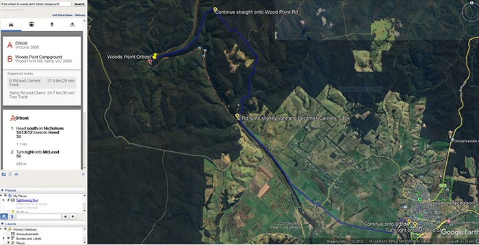 It is 22km. out from Orbost. There is only one narrow spot,that is where B Rd. turns into Garnets track.