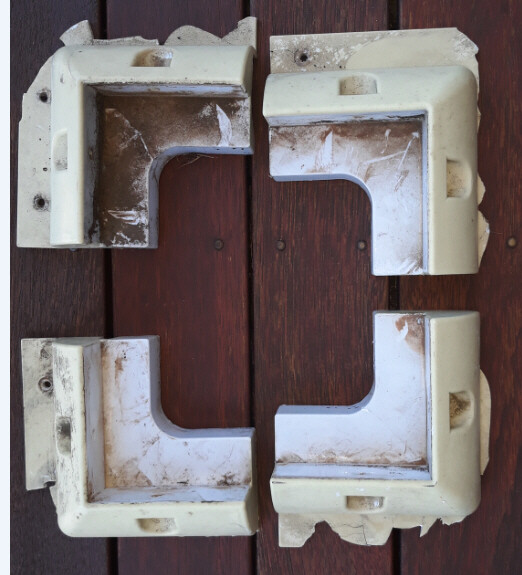 Anyway, I have had my say and hope others using platic mounts check them for cracks. I will leave it with this image of all 4 brackets showing the flanges broken off. The one in the previous photo is the top left .... the mount with the most surface area remaining. I think the one on the bottom right was floating free, entirely disconnected with broken flanges, or part thereof still adhered to the roof.