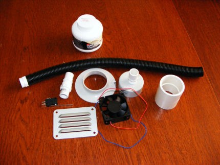 Ok here are the bits and pieces.... self explanitory though it will become clearer when the parts are assembled, the fan will be mounted within the door, the vent will be on the outside, the PVC Fittings will make up the interior cover for the fan and the actiaved charcoal filter, not shown, will be behind the vent...Not much space in there but only tricky bit I can see at this stage is mounting the micro switch so that when the blade is opened the switch turns on the fan. Will it work???? Of course - the main consideration was that it could not have too much suction as a downward beeze may not be cumfortable for some users. Maybe I'll market it under the name "the Faulty Eco Crapper"