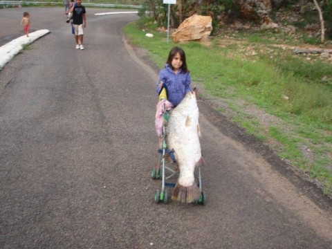 To all those into Barra fishing as I am this will make you cry . These fish are reported to have been washed over the slip way at Moondarra Dam at the Isa . Crashed onto the rocks and floating up down stream .