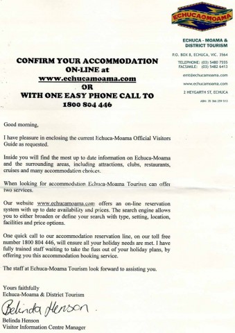well I just received a phone call from Belinda at echuca/moama at the visitor tourism information centre