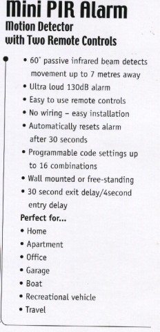 I bought a largish round one from midstate MITRE ten, supposed to be the bees knees in alarms, about $120 from memory, put it in my shed to keep the burgurglers away, any change in temperature would set it off (normally at 2 in the morning) then the battery's kept going flat then the remote wouldn't work even after changing the battery's