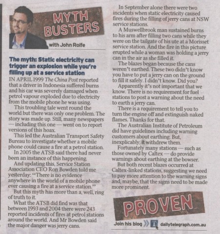 The issue of static electricity and refilling gerry cans is definitely NOT a lot of tripe.