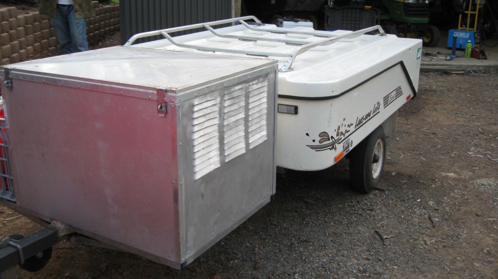 He had to stregthen the draw bar, make the box to suit, and attach the bracket for the gas bottle which will run the fridge when I'm stopped. He also added a crate to carry the small gas bottle, guy ropes etc. I can easily lift this 2kg bottle out to attach to the stove.
