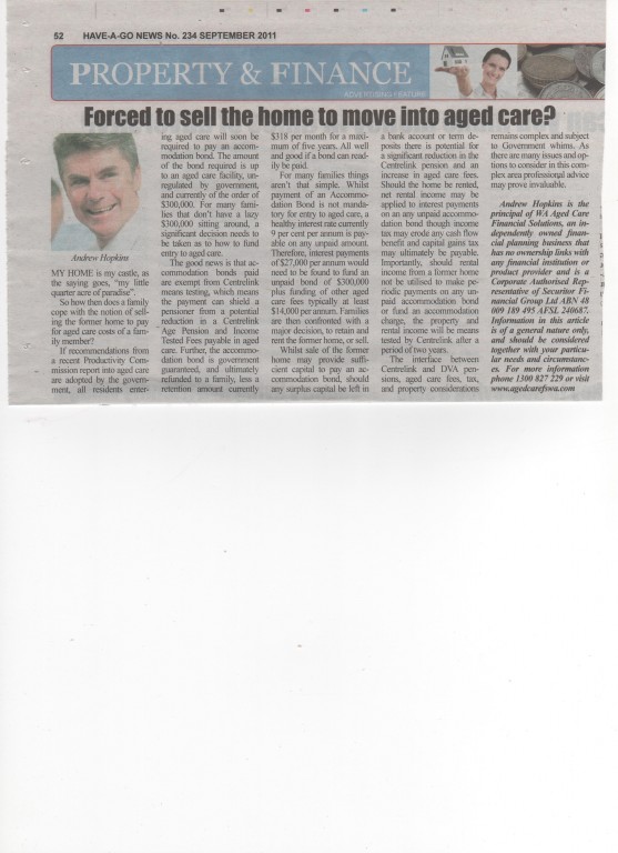 MY HOME is my castle, as the saying goes, my little quarter acre of paradise. So how then does a family cope with the notion of selling the former home to pay for aged care costs of a family member? If recommendations from a recent Productivity Commission report into aged care are adopted by the government, all residents entering aged care will soon be required to pay an accommodation bond. The amount of the bond required is up to an aged care facility, unregulated by government, and currently of the order of $300,000. For many families that dont have a lazy $300,000 sitting around, a signi cant decision needs to be taken as to how to fund entry to aged care. The good news is that accommodation bonds paid are exempt from Centrelink means testing, which means the payment can shield a pensioner from a potential reduction in a Centrelink Age Pension and Income Tested Fees payable in aged care. Further, the accommodation bond is government guaranteed, and ultimately refunded to a family, less a retention amount currently $318 per month for a maximum of ve years. All well and good if a bond can readily be paid. For many families things arent that simple. Whilst payment of an Accommodation Bond is not mandatory for entry to aged care, a healthy interest rate currently 9 per cent per annum is payable on any unpaid amount. Therefore, interest payments of $27,000 per annum would need to be found to fund an unpaid bond of $300,000 plus funding of other aged care fees typically at least $14,000 per annum. Families are then confronted with a major decision, to retain and rent the former home, or sell. Whilst sale of the former home may provide suf - cient capital to pay an accommodation bond, should any surplus capital be left in a bank account or term deposits there is potential for a signi cant reduction in the Centrelink pension and an increase in aged care fees. Should the home be rented, net rental income may be applied to interest payments on an any unpaid accommodation bond though income tax may erode any cash ow bene t and capital gains tax may ultimately be payable. Importantly, should rental income from a former home not be utilised to make periodic payments on any unpaid accommodation bond or fund an accommodation charge, the property and rental income will be means tested by Centrelink after a period of two years. The interface between Centrelink and DVA pensions, aged care fees, tax, and property considerations remains complex and subject to Government whims. As there are many issues and options to consider in this complex area professional advice may prove invaluable. Andrew Hopkins is the principal of WA Aged Care Financial Solutions, an independently owned nancial planning business that has no ownership links with any nancial institution or product provider and is a Corporate Authorised Representative of Securitor Financial Group Ltd ABN 48 009 189 495 AFSL 240687. Information in this article is of a general nature only, and should be considered together with your particular needs and circumstances. For more information phone 1300 827 229 or visit www.agedcarefswa.com