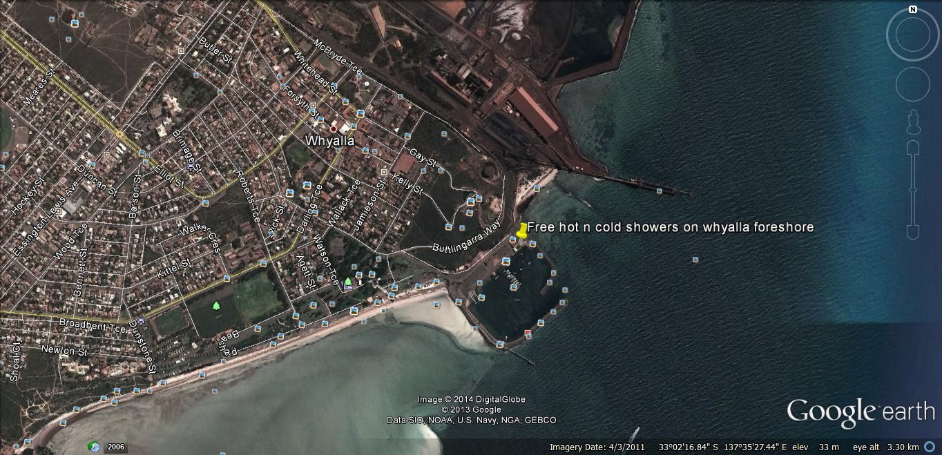 If you are just passing Whyalla there are free hot n cold showers at the foreshore, next to the yach club, but after app 11 am they maybe just warm as the water system is put on at app 4 am to 6 am for the swimmers to use after there swim.