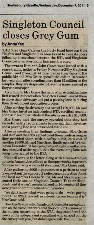 Hi all.just bringing you the latest news from the GREY GUM. Council issued the closure order on November 25th..Friday. To be honest, I was too upset to bring you the bad news. They said that our presentation, with our/your petition, our letters of support from the police, the ambulance, the defence force, the fire brigade, our letters from Alan Jones, George Souris etc were unconvincing and in the name of SAFETY we needed to cease operations. On Sunday the 27th, we were visited by an angel in disguise of a motorbike rider. His name was Brian Woods and he is the Chair of the Road Safety Committee for the Motorcycle Council of NSW. He said he would make representation to the Minister for Roads and the RMA on Monday. By Monday we had an email from the Manager Road and Traffic Safety for the RMA, by Tuesday we had an appointment for them to inspect. They arrived Thursday morning with a real lets work this out attitude. They said they did not want us to cease to trade, they did not want us to remove our signage from the road as we had been insructed to do by Council. They acknowledged that we have made a very sound contribution to safety on the Putty Rd. They advised that they would petition Council to revoke the cease trading order and that they would not support Council in any court action. They sent a road crew out on Saturday morning (Dec 3) and installed additional signage and they have closed off the southern most driveway entry. There are some works to be done on the remaining entry way but nothing in the vicinity of what Council was demanding and the RMA are going to work with us to get this done at minimum cost to us. Last night Council sent an email revoking the CEASE TRADING Order. There are SOOOO many people to thank, I dont know where to start.but to each and every one of you who signed our petition, who have rung us with your support, who have posted us on forums and facebook, who have written letters to the authorities..WE THANK YOU. At last we can get back to the business running a cafe and improving our service to you. THANK YOU THANK YOU THANK YOU Kim and John