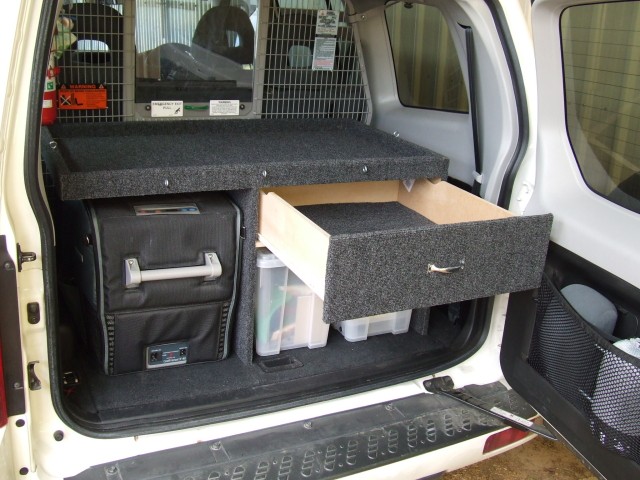 I made up a shelf storage area designed so I can still lift the floor cover out to get at the gear