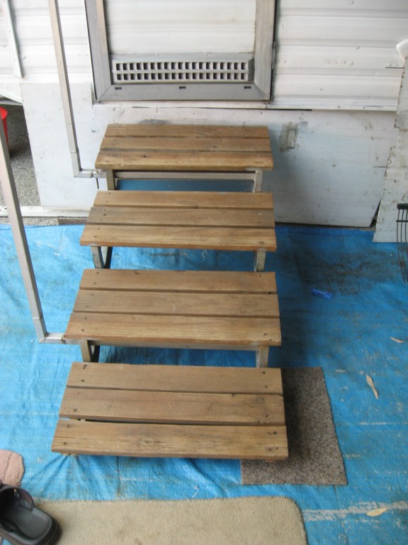Hi, i have read all the comments on the steps most of which are quite good, but none would be of any use to me and i can't be the only one with leg dramas, weight dramas, etc etc. I am one of the lucky ones as my hubby is very handy with his hands and has made me what i reckon is the best set of steps. They have a removeable hand rail which i can't do without, the steps are wooden on a metal frame which hooks onto the bar that the original steps works off. It doesn't matter if you have to jack the up or let down a bit the angle will still work, will try to put some photos on.
