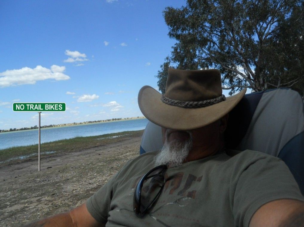 Just back from a few days at Greens with some lovely people. It was magic. Michael, Norma, Jules, Billeeee and myself. Tess called in for a cuppa. Busy weekend being a long weekend here but this morning woke up to silence except for a kookaburra in the distant. The lake stayed a mirror finish till about 3pm this arvo when some families came out with their boats. Had a nice relaxing few days so I can get back into packing boxes. Grey Nomads are the best. I have been offered every possible bit of empty space in their vans to take some stuff up to Qld for me. What would we do without this wonderful forum. Oh, and I saw Jules riding the bike all over the park grounds. She did really well.