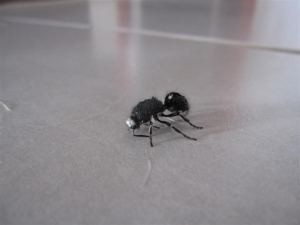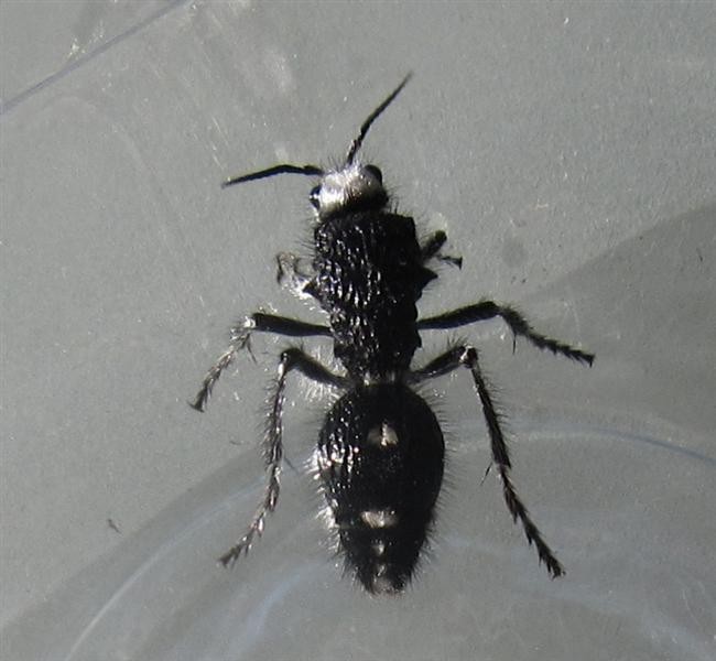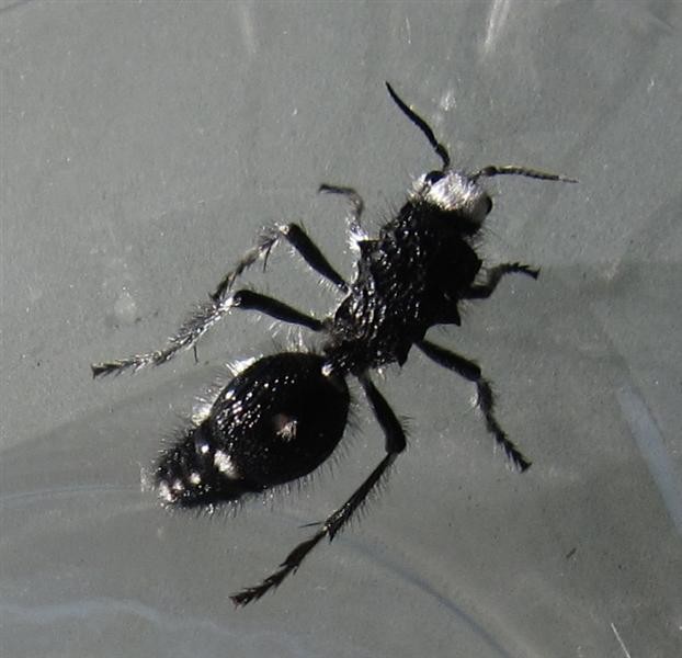 It is about 1cm long, black with white dot on the back of the head and a couple white dots on the top of the abdomen. There are white stripes under the abdomen as well.