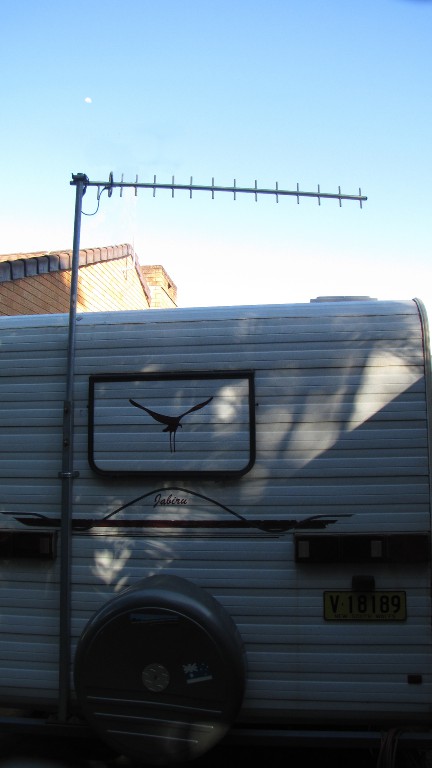 currently we have it taped to extended camping poles tied to the bikes on the back of the van. Will remove it when travelling and probably look at a more permanant arrangement for fixing to the van bumper bar using an extendable pole. Aerial is about 3 foot in length and came with 8 mts of cable.