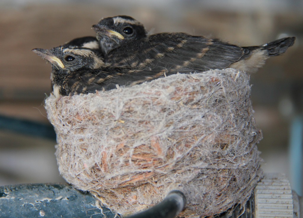 Willy Wagtail babies in our garden shed guarded by a very grumpy Dad.