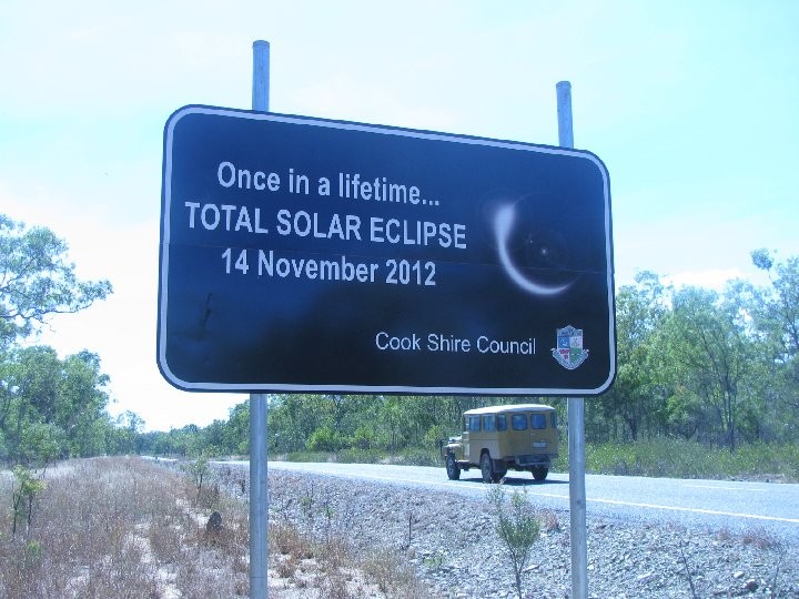 We have recently returned from Cooktown (northern Queensland) and saw an unusual sign about the 'Solar Eclipse' due to take place on 14 November 2012. The highway sign is located mid-way between Lakeland and Mt Molloy.