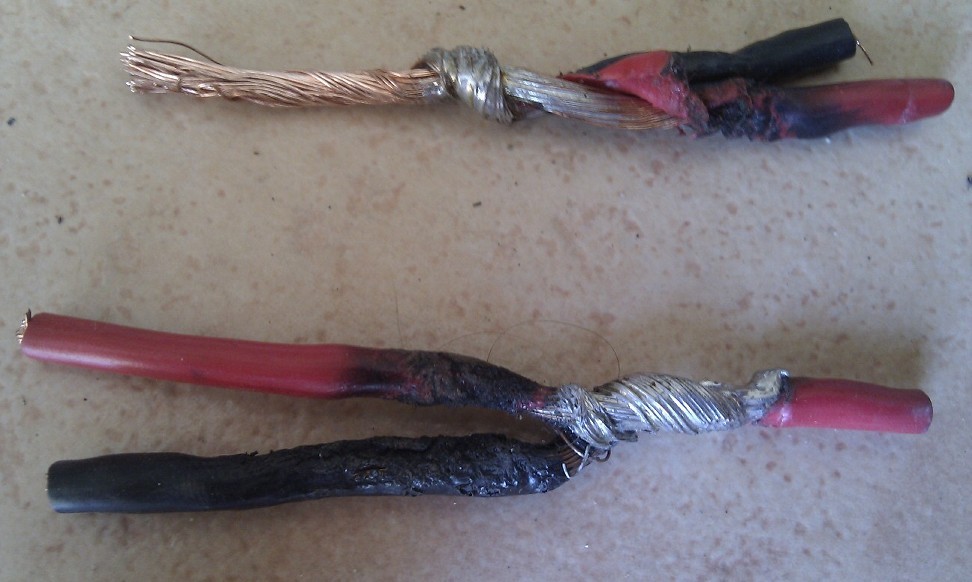 As you can see, these joints were made using a small butane torch which has overheated the joints and burnt the insulation. If you look closely at the top one, you can see that the joint has probably only 10% wetting (solder flow) between the 2 pieces of wire.