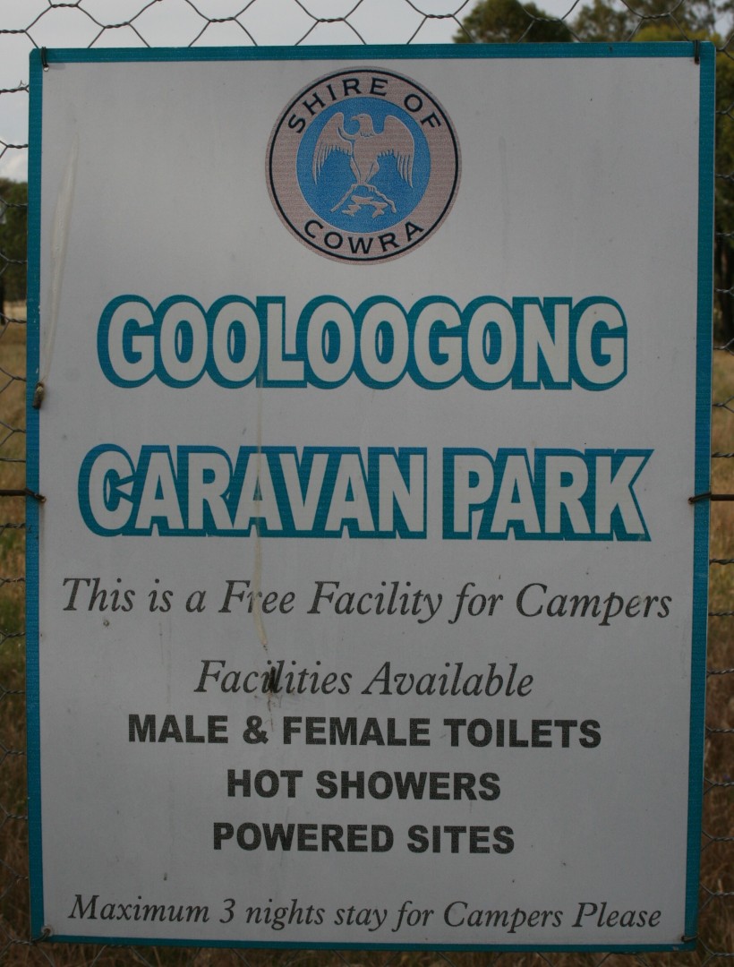 We have just stayed at Gooloogong and it's a great little spot. Local shopkeeper is very happy to see people staying. There is a donation box and it's good to give a bit in return for free power and hot shower (even though it says it is free) - plus spend some money in the town.