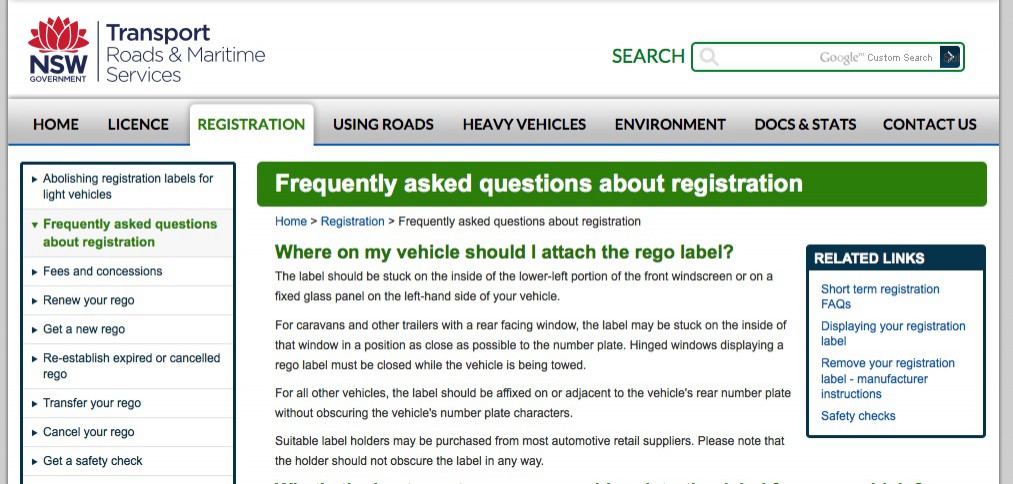 The sire is http://www.rta.nsw.gov.au/registration/rego_faq.html