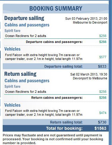 hi again, re the daylight sailing, you buy a day ticket only , 2 pensioners $420 return plus whatever vehicle and van you have,. ours is $1560 total. cheers GG,,s