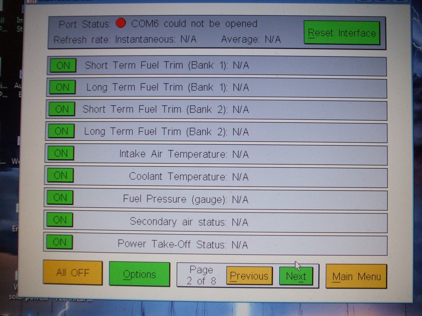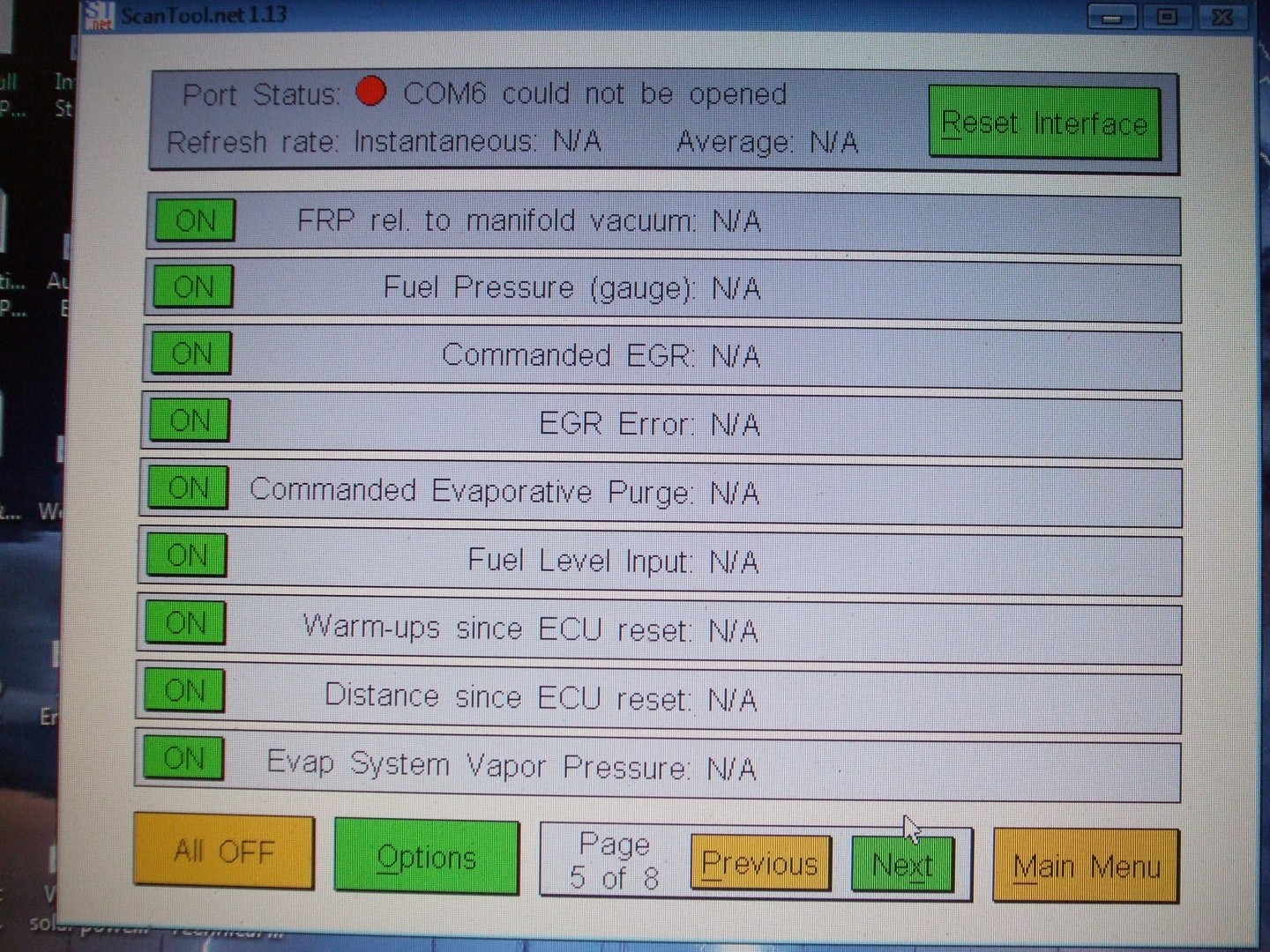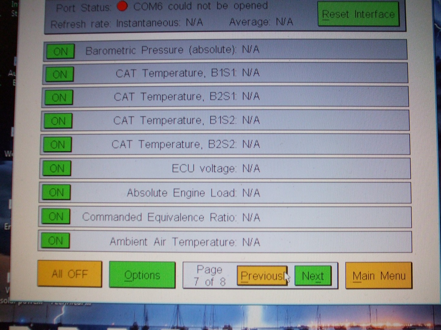 Hey DeBe, it looks like it's not communicating with you I/O port (Port Status Com 6 could not be opened) did you get any meaningful readings from it?