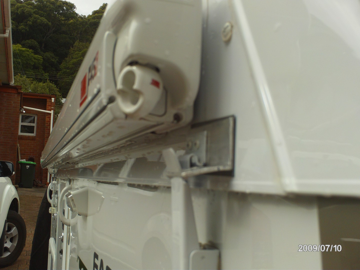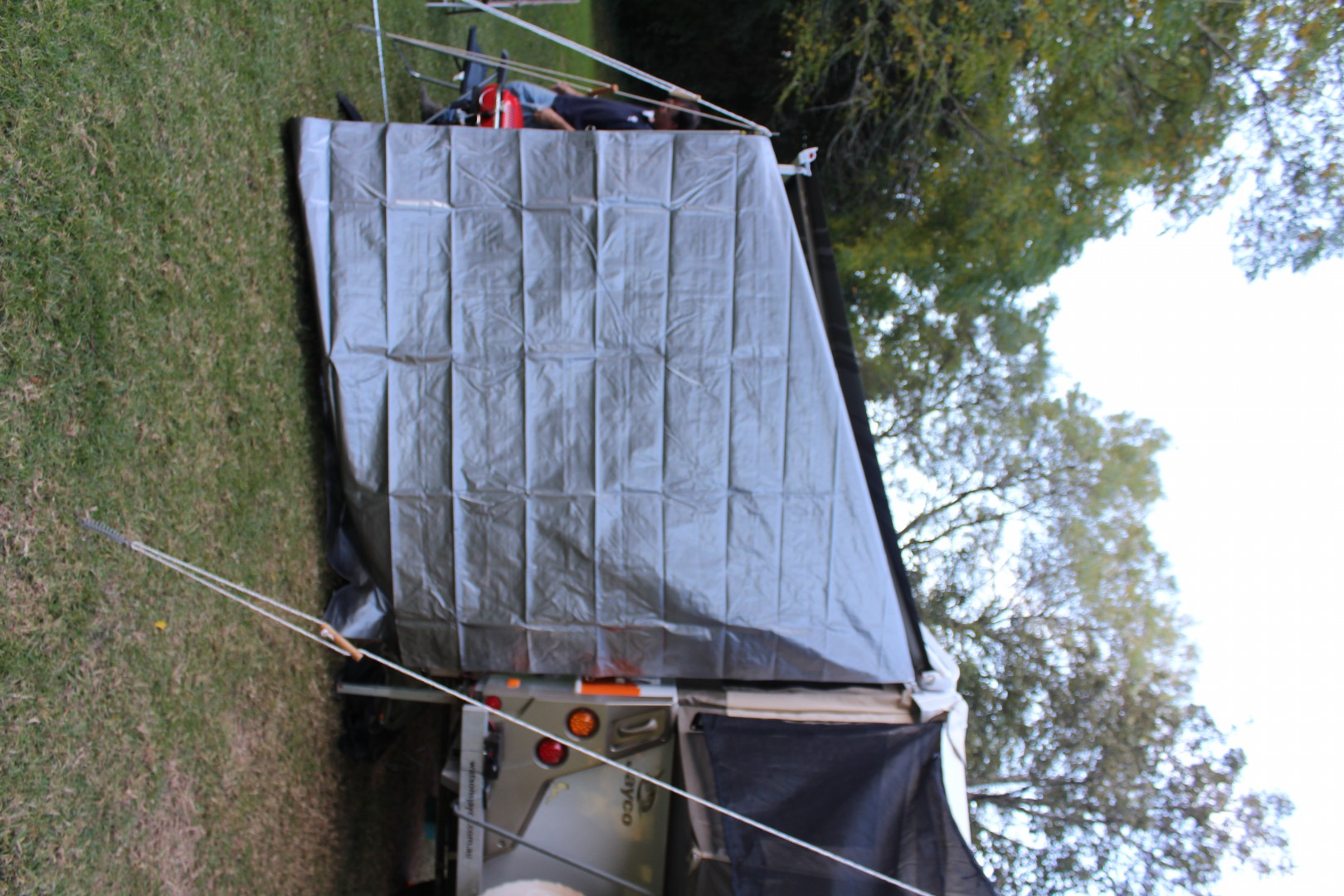 Here are some photos of our prototype. Partner made a steel bracket with sits behind the latch on the Eagle and the pole with hook on the end sits in that. We just used a silver tarp and were going to cut an angle in the top but realised the angle will always vary depending on setup. The tarp now folds over the top and ties down with bungee cords. (we need to fine tune that a bit).