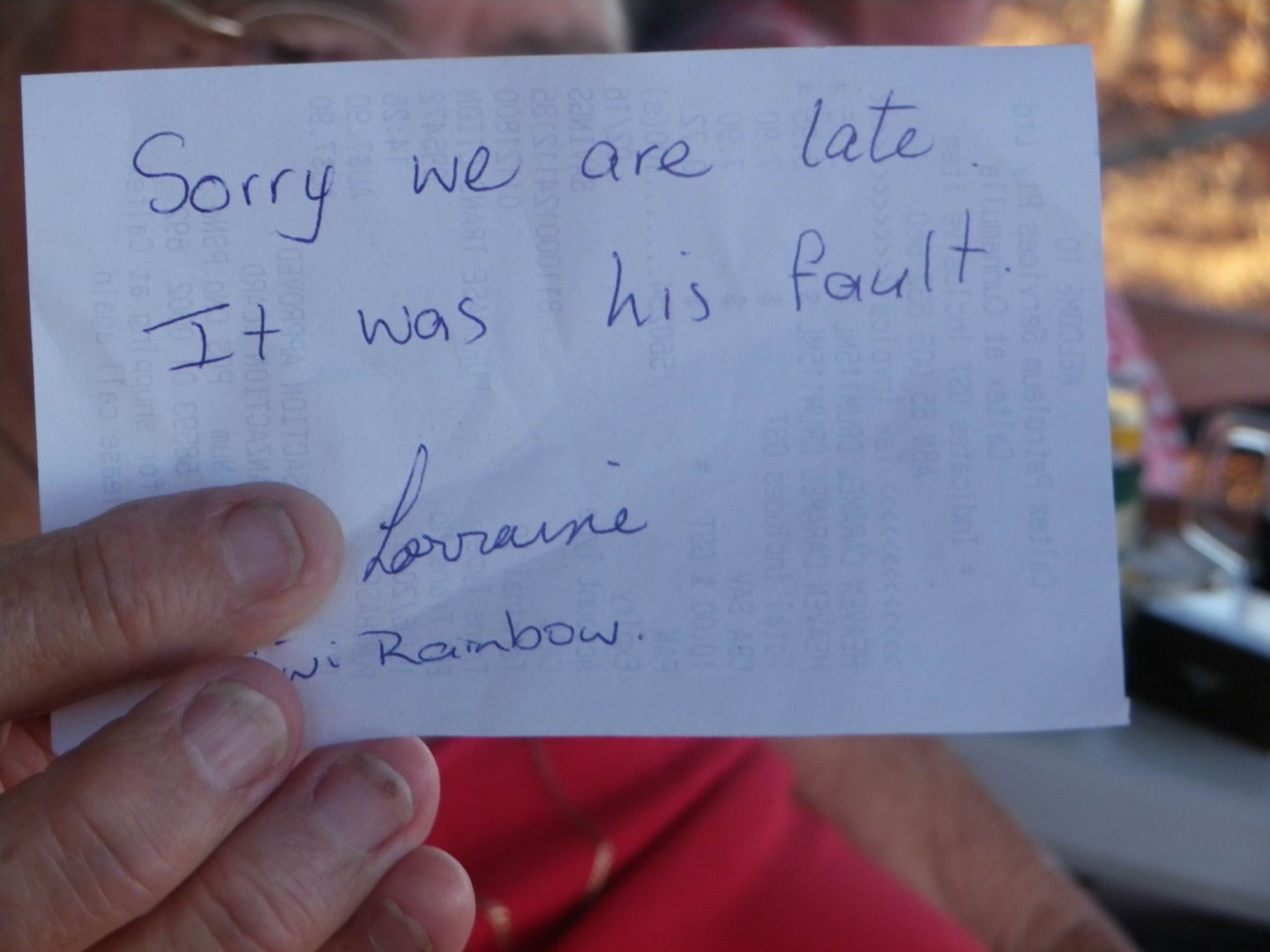 Yep we were just sitting minding our own business and there was a message on the phone ,Kiwi,s had found us and said the next day mid afternoon they would be where we are ,waiting,waiting,waiting,eventually they turned up with a late note but all is well and good a piece of well executed stirring of the pot