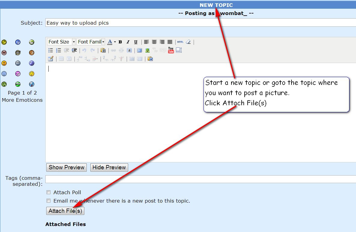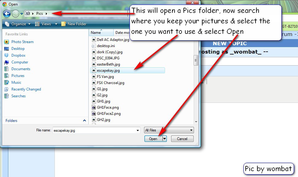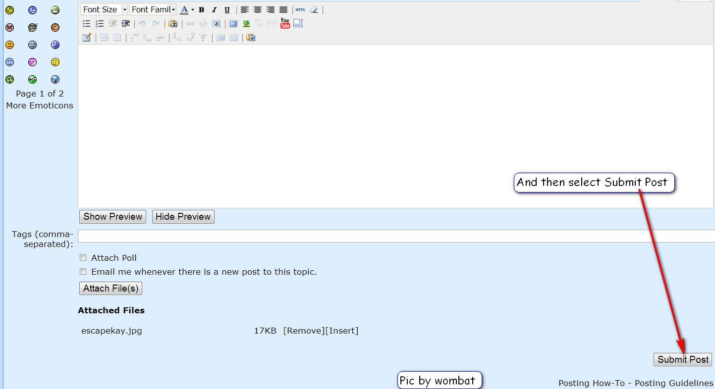 If I could just add to that, make sure the pic you are posting has been downsized with one of your programs prior to this action.