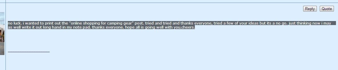 no luck. i wanted to print out the "online shopping for camping gear" post. tried and tried and thanks everyone, tried a few of your ideas but its a no go. just thinking now i may as well write it out long hand in my note pad. thanks everyone. hope all is going well with you.cheers.