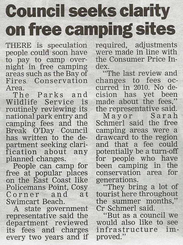 Tasmania, a beautiful State, but the economic basket case of Australia. Population around 500,000, unemployment rate over 8%, businesses closing every day, people can't get jobs, but Tourism, the life blood of the State is not exploited by State and Federal Governments. If you have a MH under 7 meters in length, you can travel on the Spirit between Melbourne and Devonport at the same rate as a car. But have a vehicle towing a caravan, $2000.00 plus is not uncommon for the round trip. After a Report prepared by the State Govt. over a year ago, State Govt. Councils are looking to charge for what was once free camping areas. This article appeared in The Sunday Examiner, Launceston, today: